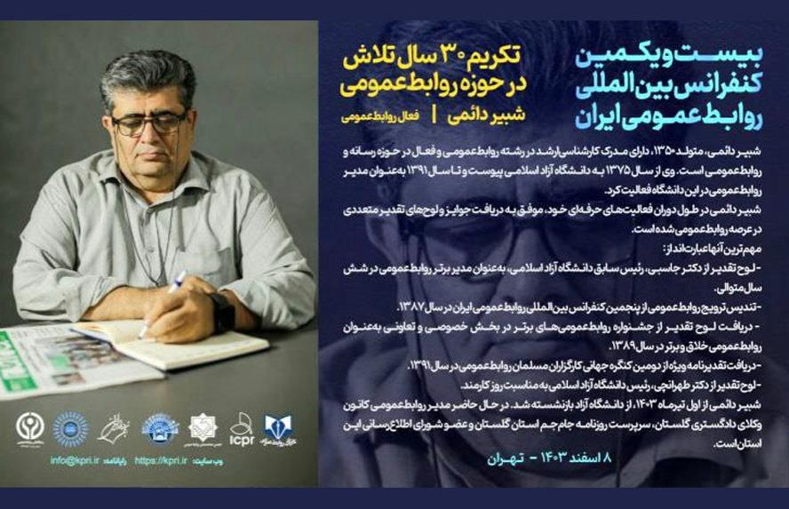 به گزارش آسیانیوز ایران ؛ شبیر دائمی، فعال در حوزه روابط عمومی با ۳۰ سال تجربه در دانشگاه آزاد اسلامی و رسانههای معتبر، در آیین افتتاحیه بیست و یکمین کنفرانس بینالمللی روابط عمومی ایران که در ۸ اسفند برگزار میشود، تکریم میگردد.