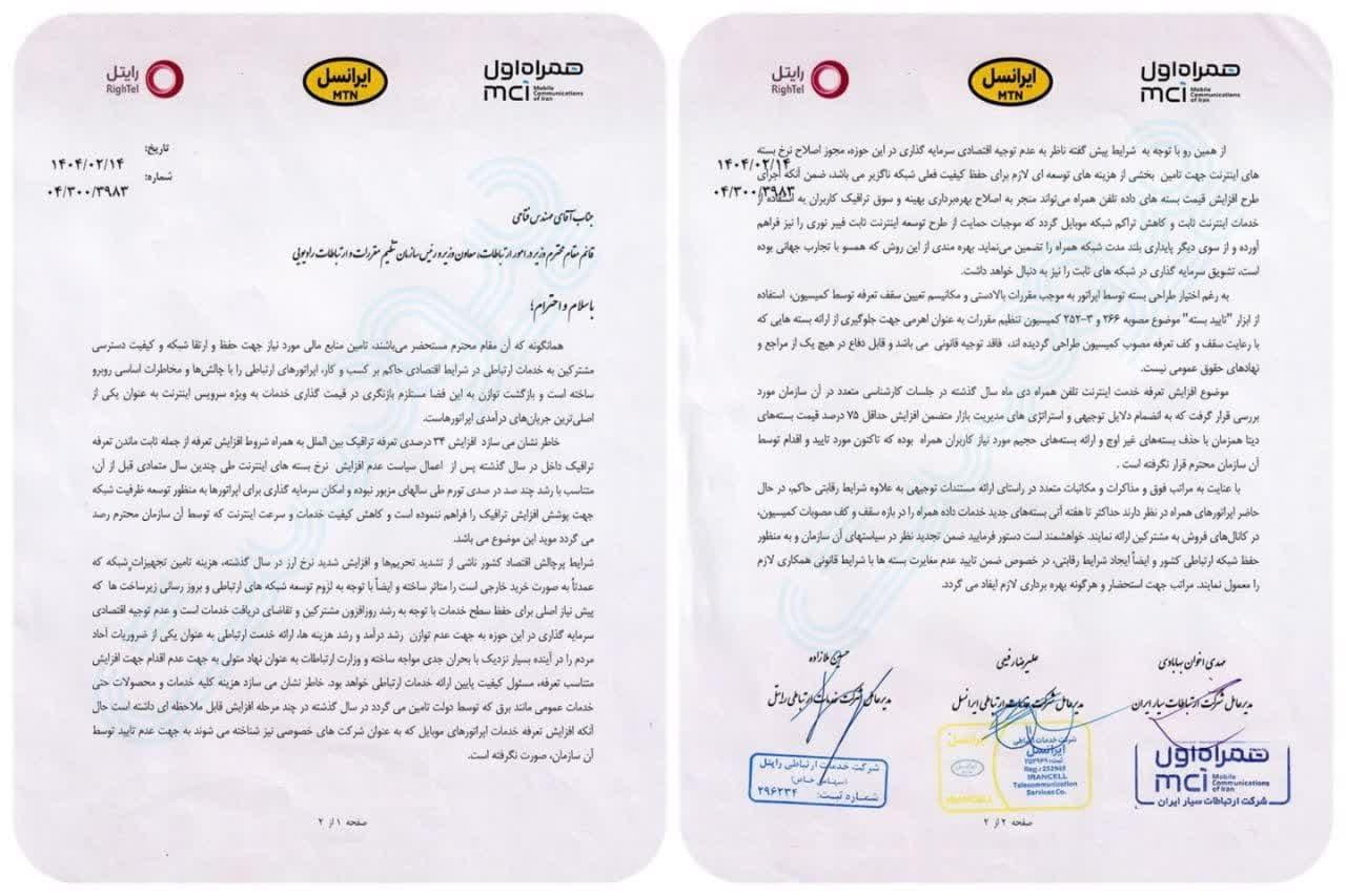 در بخشی از این نامه، آمده است که از دی ماه سال ۱۴۰۲ اپراتورها دلایل توجیهی خود برای «افزایش حداقل ۷۵ درصدی قیمت بستههای دیتا همزمان با حذف بستههای غیر اوج و ارائه بستههای حجیم مورد نظر کاربران همراه» را به رگولاتوری ارائه کردهاند؛ اما تاکنون موافقت این نهاد را به دست نیاوردهاند. طبق محتوای نامه ارسال شده، سه اپراتور موبایل همراه اول، ایرانسل و رایتل رسماً اعلام کردهاند تغییرات تعرفه را در بستههای جدید اعمال خواهند کرد.
