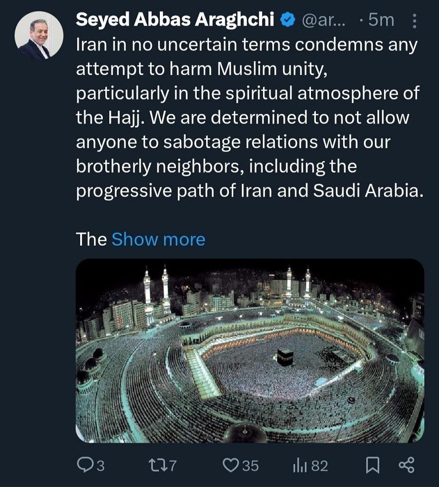 جمهوری اسلامی ایران با صراحت کامل هرگونه تلاش برای ضربه زدن به وحدت مسلمانان را، بهویژه در فضای معنوی حج، محکوم میکند. ما مصمم هستیم که به هیچکس اجازه ندهیم به روابط برادرانه ما با همسایگانمان، از جمله به مسیر رو بهجلوی روابط با عربستان سعودی، آسیب بزند. ایران مدیریت شایسته و کارآمد حج امسال را به خوبی ارج می نهد. با درود و دعای خیر برای دولت و ملت عربستان سعودی در میزبانی از زائران بیتالله الحرام، آرزوی توفیق و سربلندی ایشان در ادامه این مسیر را دارم.