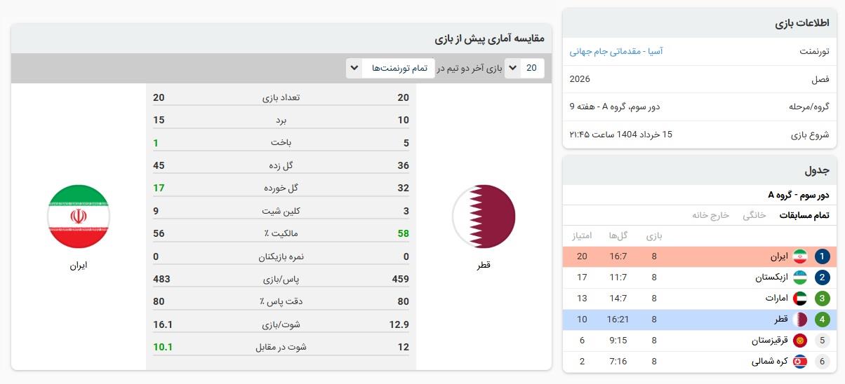 • نکته کلیدی: قطر با ۱۴ امتیاز چهارم جدول و نیاز به پیروزی برای تضمین صعود