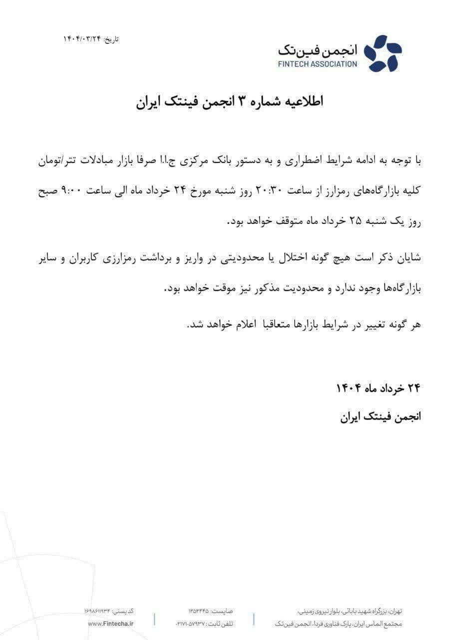 در پی صدور دستور تازه‌‌ی بانک مرکزی جمهوری اسلامی ایران و با توجه به ادامه شرایط اضطراری در کشور، انجمن فین‌تک ایران طی اطلاعیه‌ای رسمی از توقف موقت بازار معاملاتی تتر/تومان در تمامی صرافی‌های رمزارزی کشور خبر داد. این تصمیم از ساعت ۲۰:۳۰ روز شنبه ۲۴ خرداد آغاز شده است و تا ساعت ۹ روز یکشنبه ۲۵ خرداد ادامه خواهد یافت.