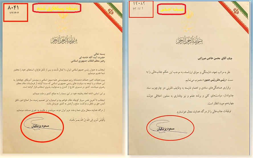 این ادعا و نامه ساختگی و بیاساس است. نامه منتشر شده، نسخهای دستکاری شده از حکمی است که قبلاً پزشکیان برای محسن حاجی میرزایی به عنوان رئیس دفتر رئیسجمهور صادر کرده بود. امضای پزشکیان در این نامه جعلی و حکم اصلی دقیقا یکسان است، در حالی که امضاهای او در احکام دیگر جزئیات متفاوتی دارند. علاوه بر تغییر متن به نامه استعفا، تاریخ و شماره نامه نیز در نسخه دستکاری شده عوض شده است. همچنین، نحوه ثبت تاریخ و شماره نامه در نسخه جعلی (به صورت تایپی دیجیتال) با احکام معمول دفتر ریاست جمهوری (که چاپی هستند) تفاوت دارد.