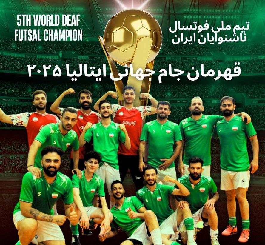 قهرمانی ایران در جام جهانی فوتسال ناشنوایان 2025 ایتالیا، پس از عبور قاطعانه از تیم‌های قدرتمندی چون لهستان و کرواسی به دست آمد. بازیکنان ما ثابت کردند که محدودیت‌های جسمی نمی‌تواند سد راه عزم و اراده آنان شود. این افتخارآفرینی، یکی دیگر از صفحات زرین ورزش ایران را رقم زد و نشان داد که "صدای افتخار، همیشه از دل سکوت برمی‌خیزد". امروز تمام ایران به این قهرمانان واقعی می‌بالد که با وجود همه دشواری‌ها، پرچم کشورمان را در بالاترین جایگاه جهان به اهتزاز درآوردند.