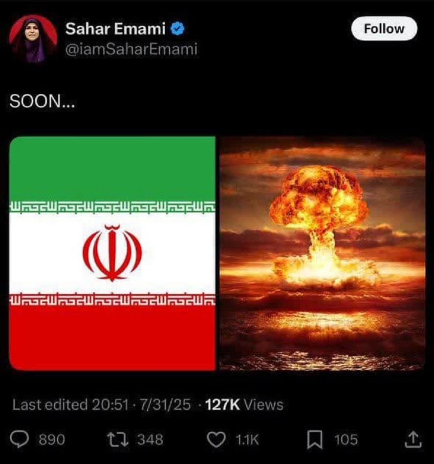 توئیت جدیدی در شبکه اجتماعی ایکس، از اکانتی منتسب به سحر امامی منتشر شده است که در آن عکسی با پرچم ایران و تصویری از انفجار بمب اتمی در کنار آن دیده می شود؛ با کپشن: به زودی(Soon)حالا بسیاری از کاربران فضای مجازی درباره این توییت سحر امامی تعابیری کردند به نظر میرسد سحر امامی منظورش دستیابی ایران به بمب اتم میباشد.