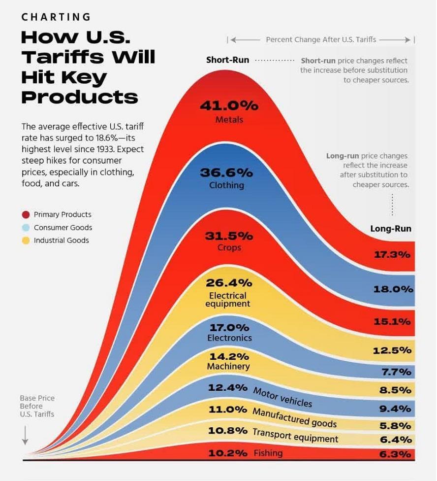 با توجه به سیاستهای تجاری دولت ترامپ، متوسط نرخ تعرفههای اعمالشده بر کالاها به حدود ۱۸ درصد رسیده است که از سال ۱۹۳۳ تاکنون بیسابقه گزارش شده است. نمودار ارائهشده اثرات تورمی این تعرفهها را بر سه گروه کالایی به شرح زیر بررسی کرده است: