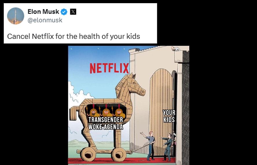 ماسک در توییتی نوشت: «برای سلامت فرزندانتان نتفلیکس را لغو کنید.» او همزمان کاریکاتوری منتشر کرد که نتفلیکس را به اسب تروآ تشبیه کرده بود؛ اسبی چوبی که حامل ایدههای ترنسجندر و وُک است و دروازه ذهن کودکان را هدف قرار داده است.
