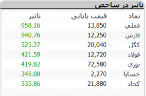 نمادهای فملی، فارس، کگل و فولاد بیشترین تاثیر مثبت بر بازار سهام را داشتند.