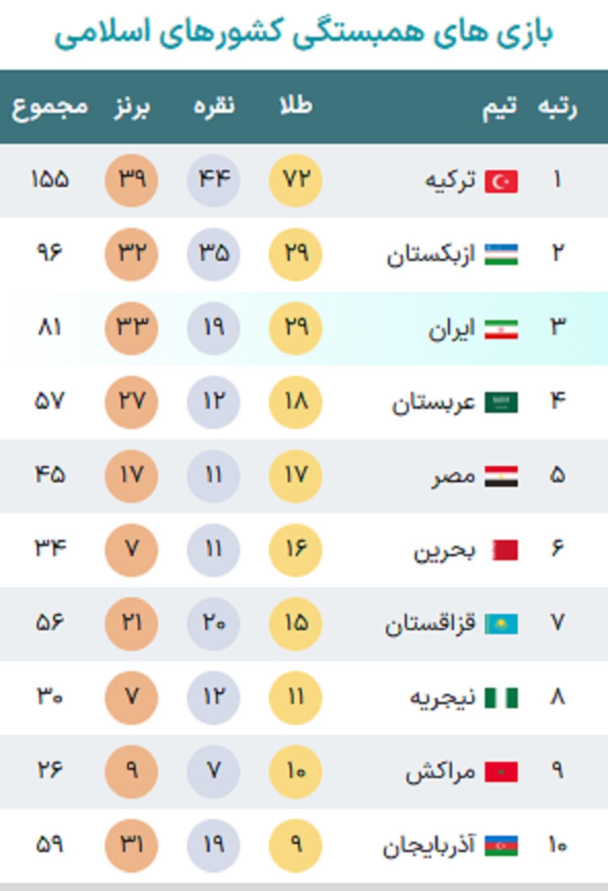 ایران با ۳۹ طلا، ۲۶ نقره و ۳۳ برنز در جایگاه سوم ایستاد.