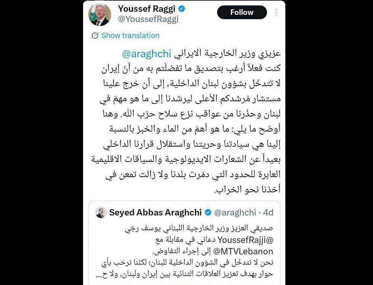 وزیر امور خارجه لبنان در پیامی مستقیم به عراقچی، وزیر امور خارجه ایران، ادعای عدم دخالت تهران در امور داخلی لبنان را به چالش کشید. عبدالله بو حبیب از حضور مشاور رهبر ایران در بیروت و اخطارهای او درباره خلع سلاح حزب‌الله پرده برداشت. بو حبیب در این پیام تأکید کرد: "آنچه برای ما از آب و نان مهم‌تر است، حاکمیت، آزادی و استقلال تصمیم‌گیری داخلی ماست." وی از "شعارهای ایدئولوژیک و دستور کارهای منطقه‌ای فرامرزی" که به ویرانی لبنان انجامیده، انتقاد کرد. این اظهارات در شرایطی بیان شده که لبنان با بحران‌های سیاسی و اقتصادی عمیقی دست به گریبان است و نقش ایران در این کشور همواره مورد بحث بوده است.