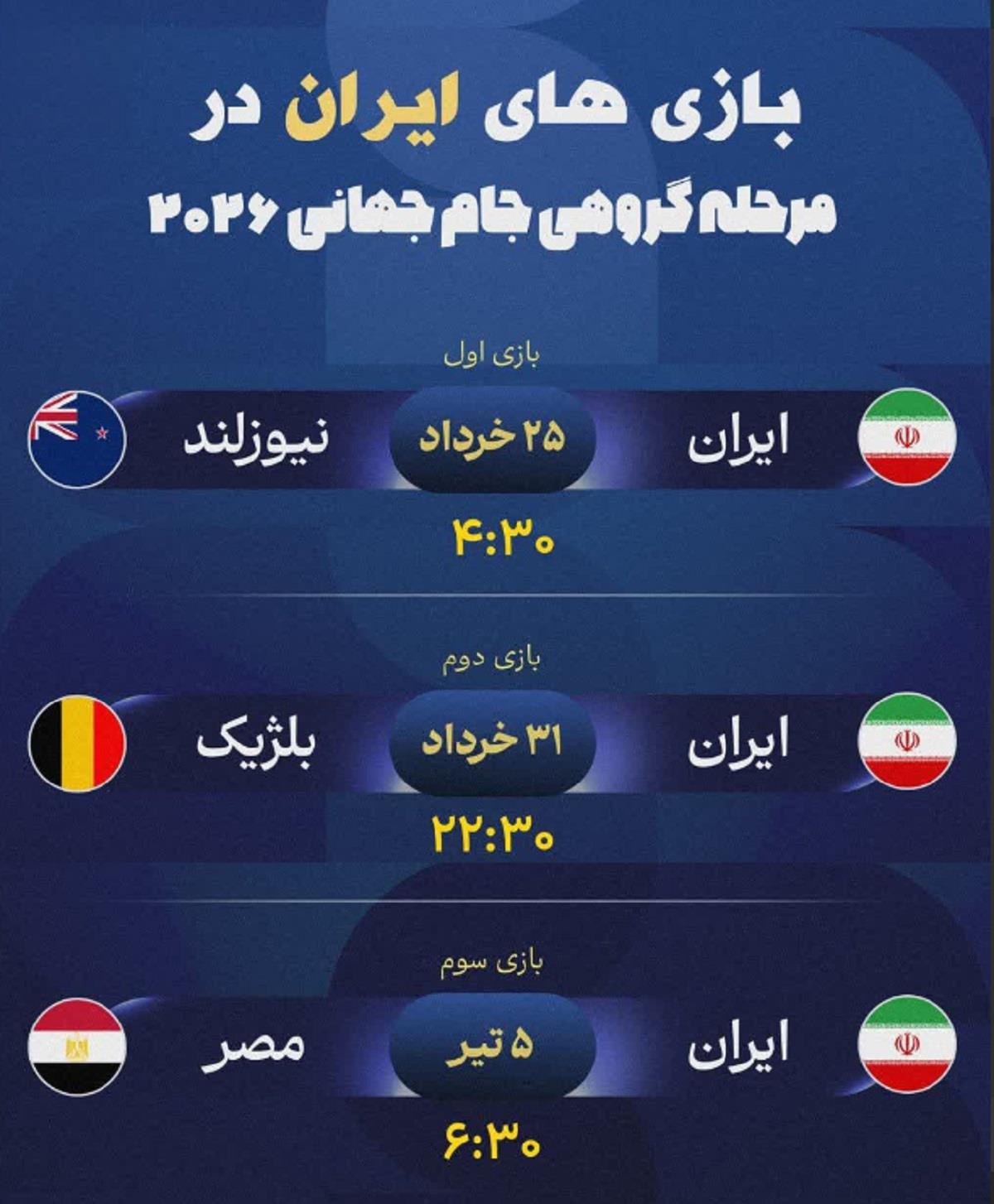 - سومین و آخرین بازی مرحله گروهی ایران در ۵ تیر ۱۴۰۵ (۲۵ ژوئن ۲۰۲۶) در شهر سیاتل مقابل تیم ملی مصر خواهد بود. شروع این مسابقه ساعت ۶:۳۰ صبح به وقت ایران است.