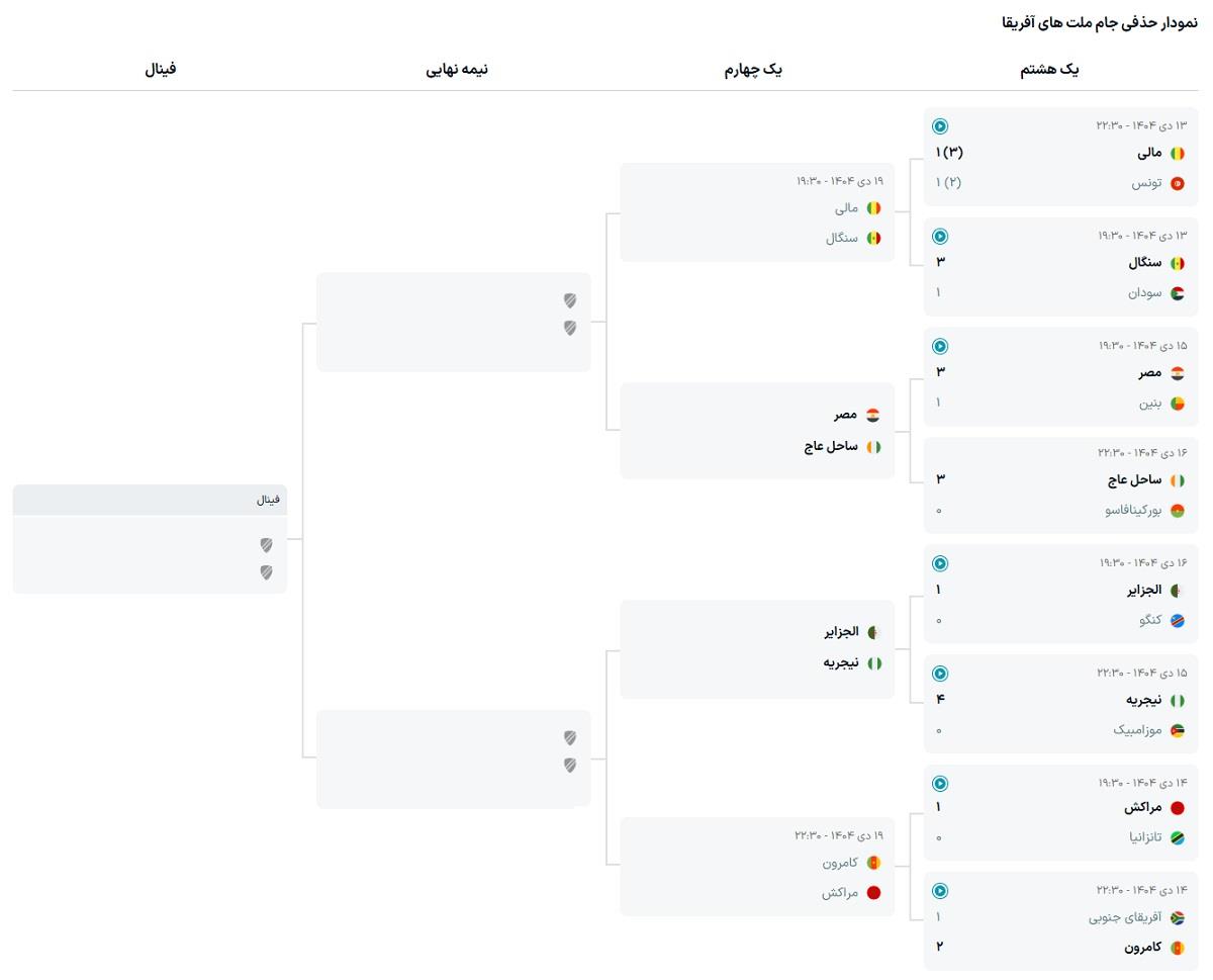 قرعه کشی، مسیرهای متفاوتی را پیش روی تیمها گذاشته است. در نیمه نخست، مالی در برابر سنگال قرار میگیرد. مالی با بازی تدافعی و متکی به ضدحمله، باید در برابر سنگال سریع و فنی مقاومت کند. شانس سنگال به دلیل قدرت حمله بیشتر، بالاتر است. در همان نیمه، کامرون سد راه مراکش میشود. کامرون تیمی قدرتمند اما غیرقابل پیشبینی است، اما مراکش به دلیل انسجام تاکتیکی بالا، شانس بیشتری برای صعود دارد. در نیمه دیگر جدول، الجزایر به مصاف نیجریه میرود که احتمالاً دیداری باز و پرگل خواهد بود. دفاع قویتر الجزایر میتواند در برابر حمله خروشان نیجریه کلید موفقیت باشد. مصر نیز با ساحل عاج روبرو میشود. مصر با بازی منطقی و دفاع محکم، در برابر مدافع عنوان قهرمانی پرهیجان ولی گاه بینظم، میتواند به صعود فکر کند. پیشبینی میشود نیمه نهایی شاهد حضور تیمهایی مانند مراکش، سنگال، الجزایر و مصر باشد.