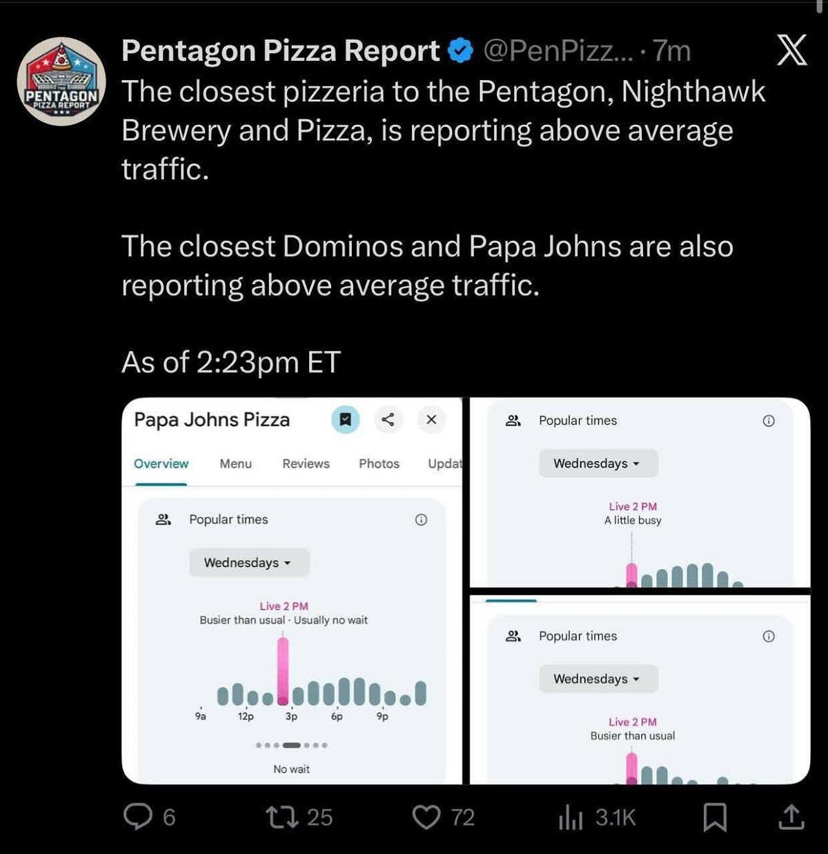در ساعات اخیر، گزارشهای غیررسمی از افزایش چشمگیر و غیرمعمول سفارشات غذا به ویژه پیتزا توسط ساختمان پنجضلعی پنتاگون منتشر شده است. این اتفاق اگرچه در نگاه اول عادی به نظر میرسد، اما در میان تحلیلگران و ناظران سیاسی و نظامی، با حساسیت زیادی دنبال میشود. دلیل این حساسیت، الگوی تکرارشوندهای است که در گذشته مشاهده شده: افزایش غیرمعمول سفارشات غذایی پنتاگون، اغلب پیشدرآمدی بر عملیات نظامی بزرگ یا بحرانهای امنیتی مهم بوده است. این همبستگی به قدری در برخی موارد آشکار بوده که به یک "شاخص غیررسمی" در پیشبینی تحرکات نظامی آمریکا تبدیل شده است. گفته میشود در آستانه حمله به عراق در سال ۲۰۰۳، عملیات موسوم به "ثعلب صحرا" و نیز در جریان برخی بحرانهای دیگر، رستورانهای اطراف پنتاگون شاهد هجوم سفارشات غذا برای کارکنان و نظامیان حاضر در این ساختمان بودند.