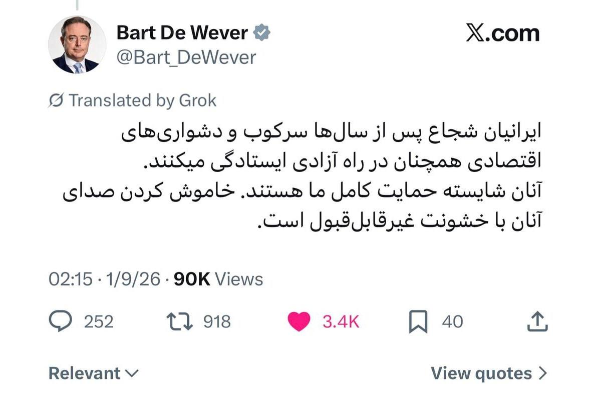 به گزارش آسیانیوز ایران ؛ Bart De Wever، سیاستمدار بلژیکی، با انتشار پیامی در شبکه اجتماعی ایکس به اعتراضات و وضعیت اقتصادی ایران واکنش نشان داد. این پیام که به زبان فارسی نیز در صفحه ایکس Wever منتشر شده، به ایستادگی ایرانیان در برابر فشارهای اقتصادی و محدودیتهای سالهای گذشته اشاره دارد.