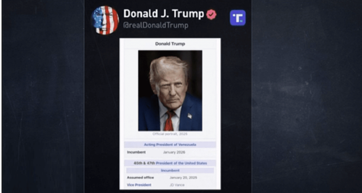 رئیس‌جمهور آمریکا با انتشار تصویری در فضای مجازی، خود را رئیس‌جمهور ونزوئلا معرفی کرد. این تصویر که مشخصات و اطلاعات فردی ترامپ در «ویکی‌پدیا» را شبیه‌سازی کرده، نشان می‌دهد که وی هم به عنوان چهل‌وپنجمین و چهل‌وهفتمین رئیس‌جمهور آمریکا و هم به عنوان رئیس‌جمهور ونزوئلا در حال فعالیت است. ​این اقدام در حالی است که بعد از بازداشت رئیس دولت ونزوئلا نیکلاس مادورو در حمله نظامی آمریکا و انتقالش به نیویورک، معاون او دلسی رودریگز بر اساس حکم دیوان عالی قانون اساسی ونزوئلا، به عنوان رئیس‌جمهور موقت سوگند یاد کرد.