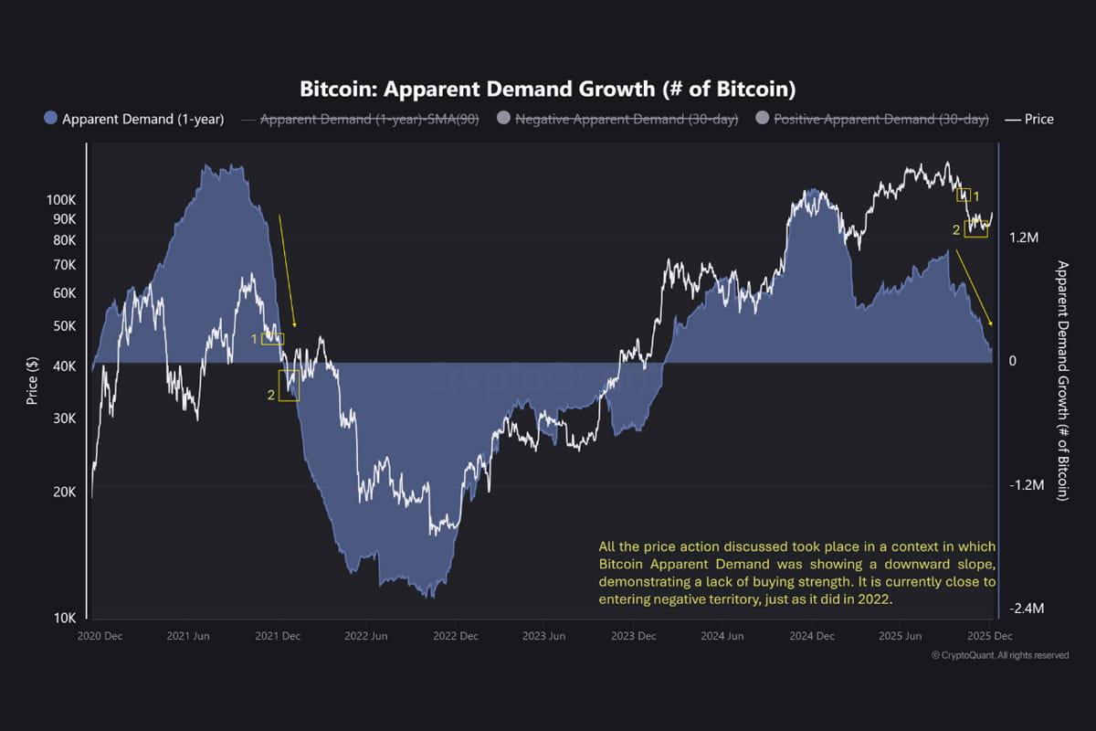 یکی از مهمترین هشدارها از شاخص «رشد ظاهری تقاضا» به دست میآید؛ معیاری که تفاوت بین بیتکوینهای جذبشده توسط بازار و بیتکوینهای تازه استخراجشده را میسنجد. این شاخص معمولاً در فازهای صعودی پایدار مثبت و در فازهای توزیع یا آغاز بازار نزولی منفی میشود. دادهها نشان میدهد رشد ظاهری تقاضا طی ماههای اخیر روندی کاهشی گرفته و از اوجهای قبلی فاصله گرفته است. این رفتار پیشتر در انتهای چرخههای صعودی گذشته نیز مشاهده شده بود؛ زمانی که قیمت هنوز بالا بود اما تقاضای خالص دیگر توان حمایت از ادامه رشد را نداشت.