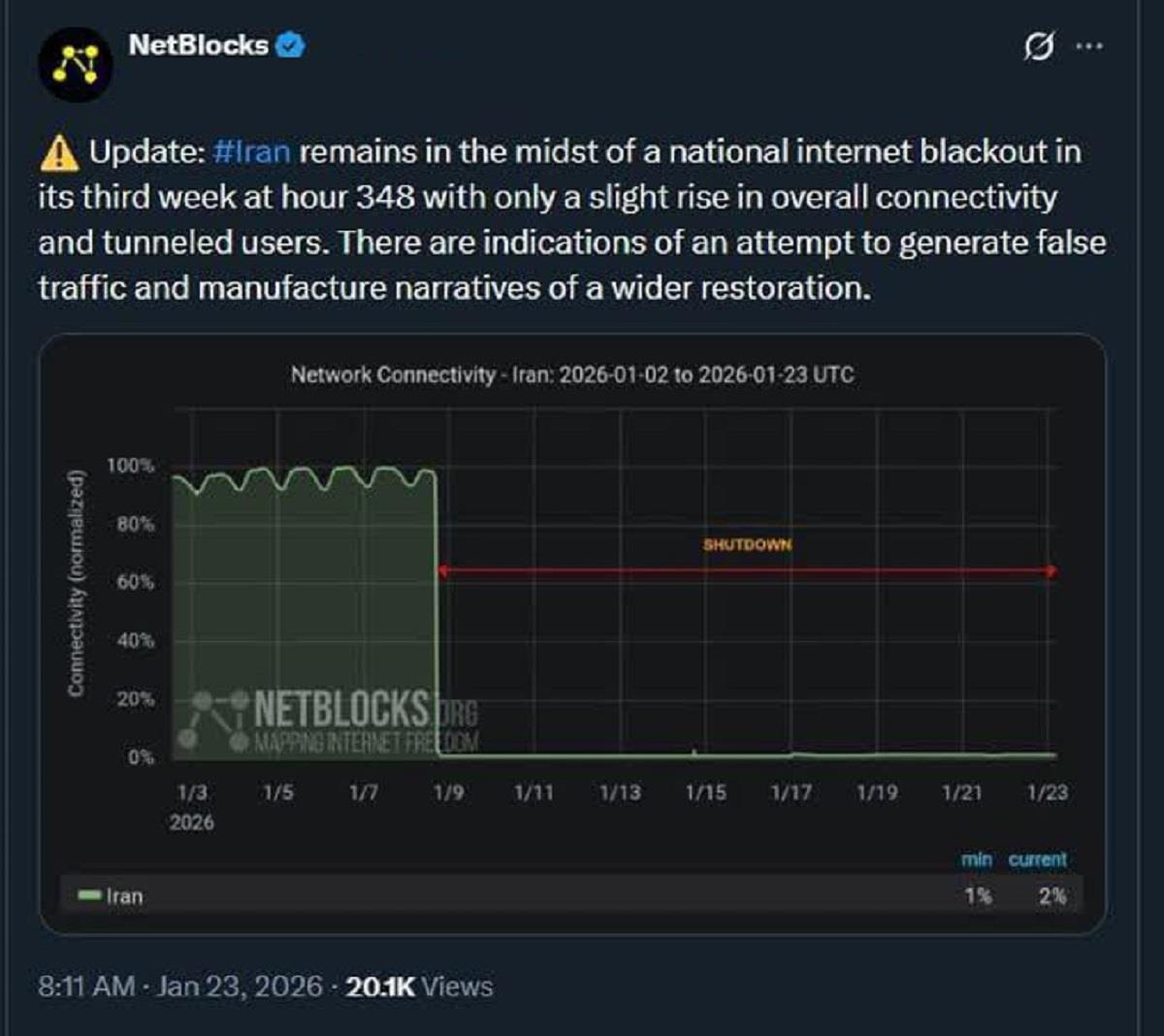 نهادهای پایش اینترنت با اتکا به دادههای ترافیکی، تصویری متفاوت از آنچه در برخی رسانهها بازتاب مییابد ارائه میکنند. کاهش شدید پهنای باند و تداوم قطعی در سطح ملی، نشان میدهد که ادعای ترمیم گسترده، با واقعیت همخوانی ندارد. وقتی داده نادیده گرفته میشود، روایت جای واقعیت را میگیرد.
