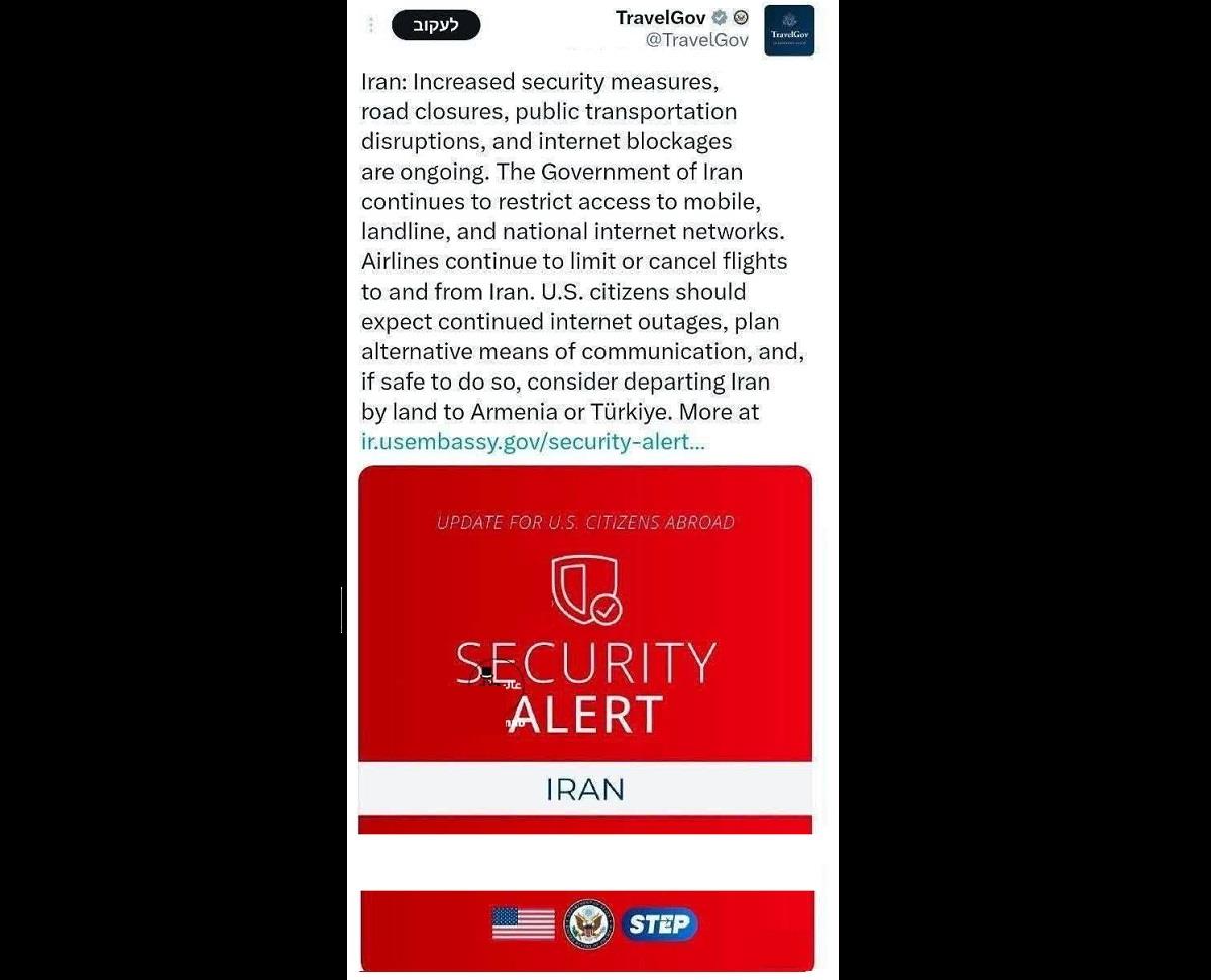 وزارت امور خارجه ایالات متحده، هشدار امنیتی تازهای برای شهروندان آمریکایی حاضر در ایران صادر کرد. این هشدار که در شرایط حساس کنونی منتشر شده، از ادامه اختلالات گسترده در زیرساختهای ارتباطی و حملونقل داخل ایران حکایت دارد. بر اساس این اطلاعیه رسمی، اقدامات امنیتی در کشور افزایش یافته و این موضوع منجر به بسته شدن برخی جادهها و اختلال در سیستم حملونقل عمومی شده است. این محدودیتها میتواند تردد در داخل شهرها و سفرهای بینشهری را با چالش مواجه کند. یکی از محورهای اصلی این هشدار، تأکید بر ادامه «اختلال در دسترسی به اینترنت» است. گزارش آمریکا ادعا میکند که دولت ایران دسترسی به شبکههای تلفن همراه، خطوط تلفن ثابت و اینترنت سراسری را محدود کرده است. این قطعی و محدودیت اینترنتی، میتواند ارتباطات روزمره، دسترسی به اطلاعات و حتی تماسهای اضطراری را تحت تأثیر قرار دهد. وزارت خارجه آمریکا به شهروندانش توصیه کرده است که برای تداوم این اختلالات آماده باشند.