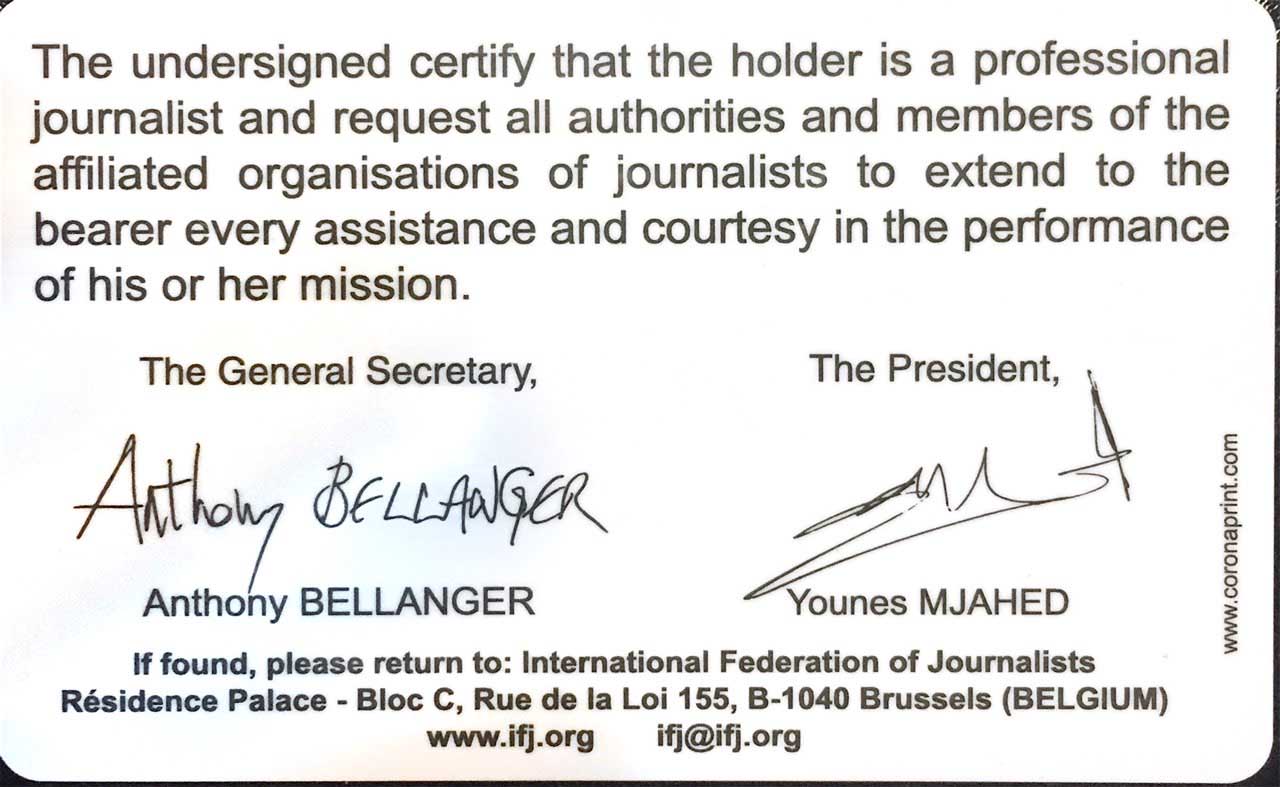 فدراسیون بینالمللی روزنامهنگاران مخالف هرگونه تبعیض در هر زمینهای است و همچنین مخالف استفاده استفاده از رسانه بعنوان مرجعی برای تبلیغ حاکمان یا ترویج تعصب و جنگ میباشد. روزنامهنگاران عضو معتقد به آزادی بیان سیاسی و فرهنگی و دفاع اتحادیه های کارگری و دیگر حقوق اساسی انسان است. این فدراسیون سازمانی است که سخنگوی روزنامهنگاران در سازمان ملل متحد و همچنین جنبش بینالمللی اتحادیههای کارگری میباشد. فدراسیون بینالمللی روزنامهنگاران از روزنامهنگاران و اتحادیههای عضو خود را هر زمان که آنها برای حقوق صنفی و حرفهای خود مبارزه کنند حمایت میکند و صندوق کمک بین المللی را در این زمینه ایجاد کرده است که وظیفه آن ارائه کمک های انسان دوستانه به روزنامه نگاران مورد نیاز میباشد.