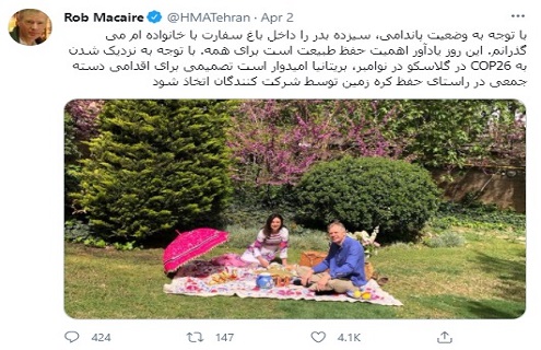 راب مَکایر، سفیر بریتانیا با انتشار عکسی توییت کرد: با توجه به وضعیت پاندامی، سیزده بدر را داخل باغ سفارت با خانوادهام میگذرانم. این روز یادآور اهمیت حفظ طبیعت است برای همه.