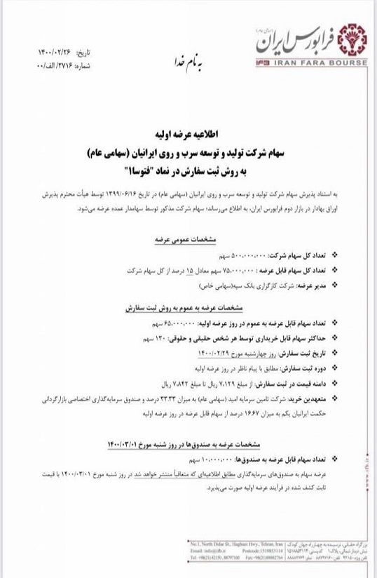 به گزارش آسیانیوز، سهام شرکت تولید و توسعه سرب و روی ایرانیان با نماد «فتوسا» روز چهارشنبه ۲۹ اردیبهشت ۱۴۰۰ در بازار فرابورس عرضه میشود.