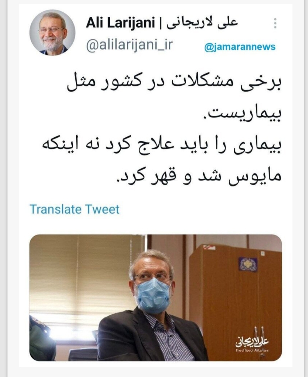 علی لاریجانی مشاور رهبر انقلاب که در ساعات ابتدایی امروز صبح رأی خود را به صندوق انداخته بود، در توئیتی نوشت: برخی مشکلات در کشور مثل بیماریست.بیماری را باید علاج کرد نه اینکه مایوس شد و قهر کرد.