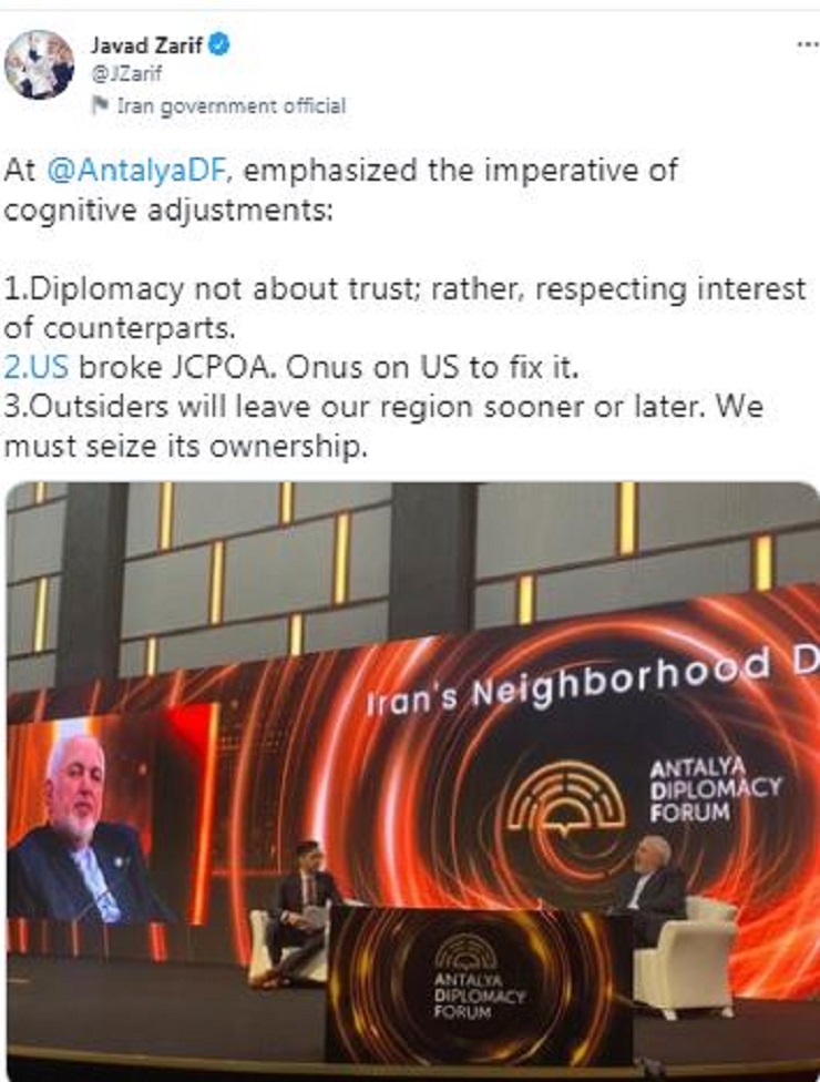 در مجمع دیپلماسی آنتالیا بر ضرورت این اصلاحات شناختی تأکید کردم: ۱. در دیپلماسی بحث اعتماد نیست، بلکه بحث احترام به منافع همتایان است، ۲. این ایالات متحده بود که زیر برجام زد و حالا هم بر عهده ایالات متحده است که باید آن را درست کند، ۳. خارجیها دیر یا زود منطقه ما را ترک میکنند. باید خودمان آن را به دست بگیریم.