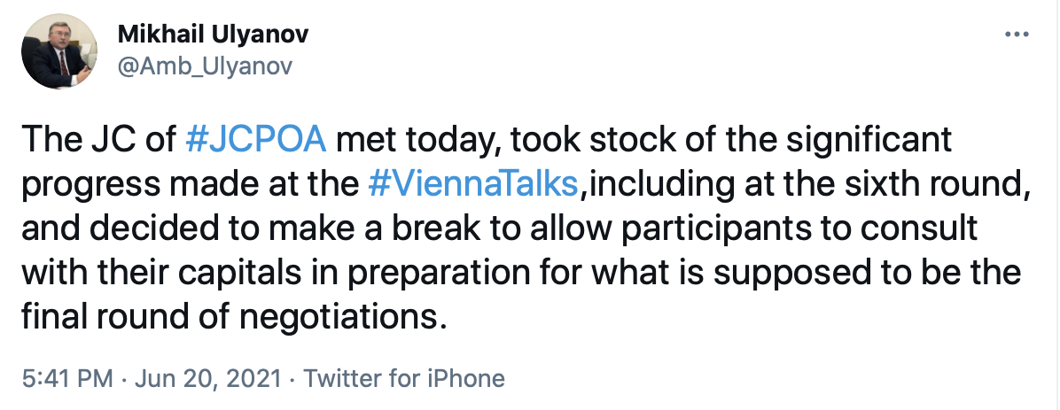 «نشست کمیسیون مشترک امروز برگزار و پیشرفت حاصله در مذاکرات وین از جمله در دور ششم ارزیابی شد. تصمیم گرفته شد که وقفهای ایجاد شود تا به مشارکتکنندگان اجازه دهد با پایتختهایشان در خصوص آمادگی برای آنچه که قرار است دور نهایی مذاکرات باشد، مشورت کنند.»