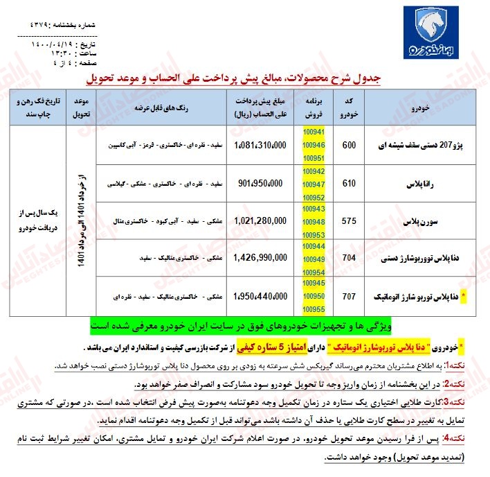 در این طرح پنج محصول پژو ۲۰۷ دستی سقف شیشه‌ای، راناپلاس، سورن پلاس، دناپلاس توربوشارژ دستی و اتوماتیک ارایه خواهد شد و موعد تحویل همه خودروها از خرداد تا مرداد ماه سال آینده تعیین شده است.