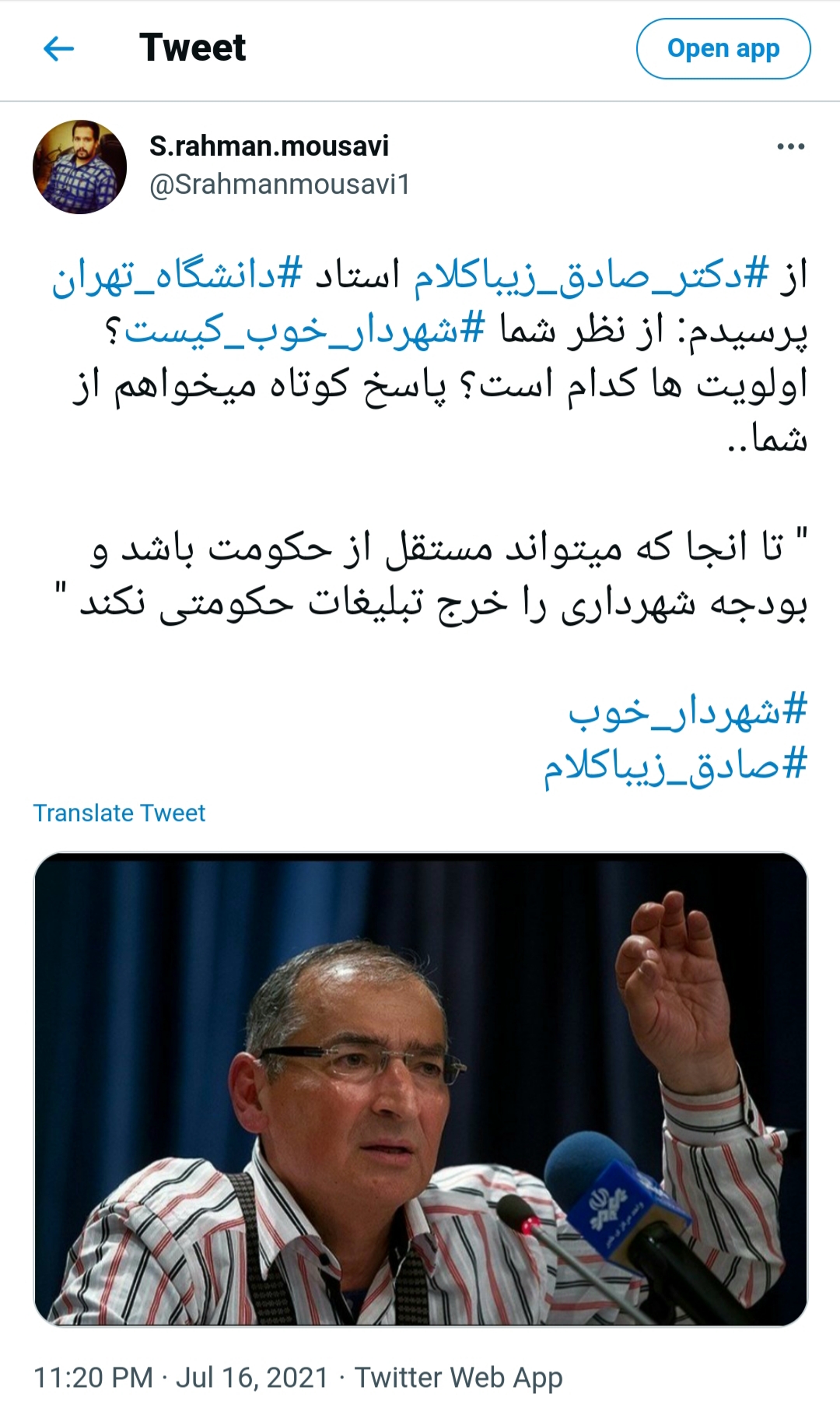 از #دکتر_صادق_زیباکلام استاد #دانشگاه_تهران پرسیدم: از نظر شما #شهردار_خوب_کیست؟ اولویت ها کدام است؟ پاسخ کوتاه میخواهم از شما..