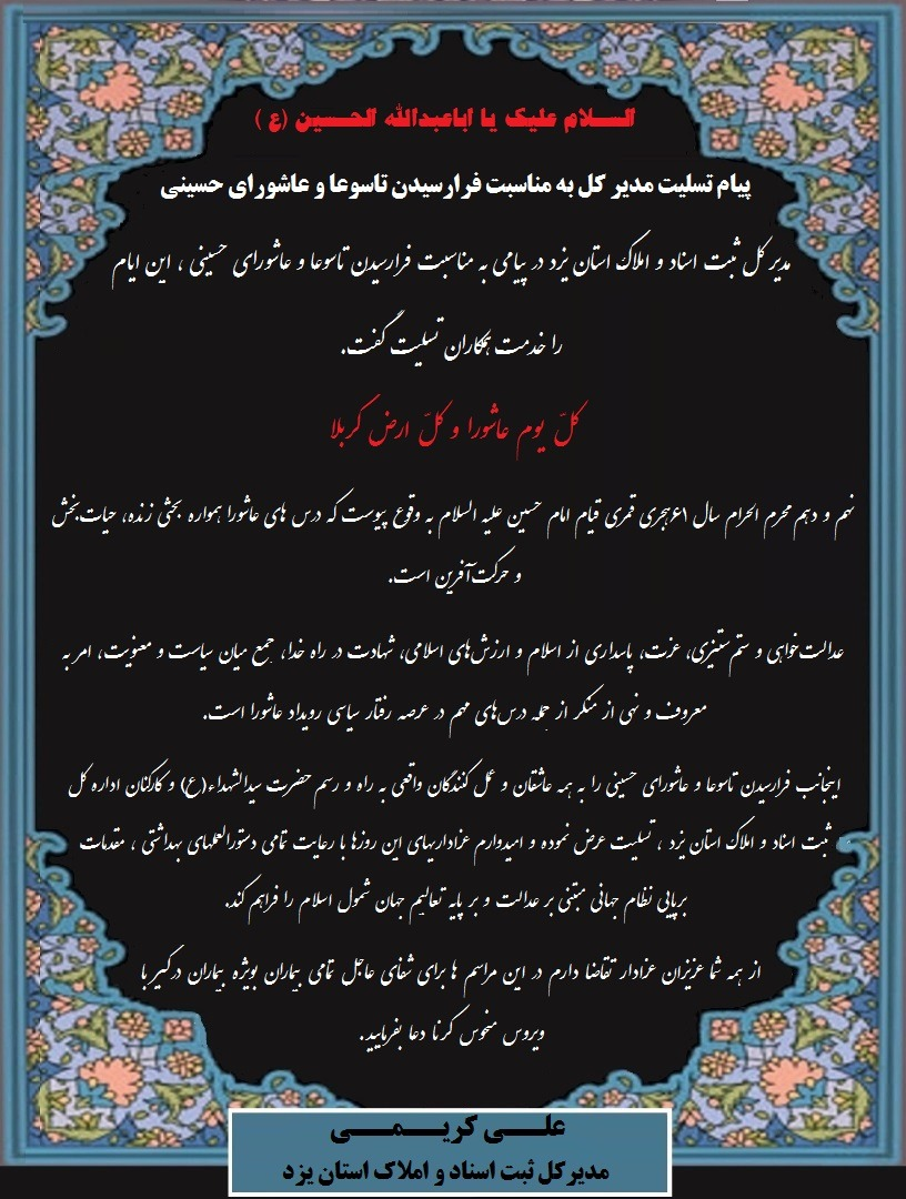 اینجانب فرارسیدن تاسوعا و عاشورای حسینی را به همه عاشقان و عمل کنندگان واقعی به راه و رسم حضرت سیدالشهداء(ع) و کارکنان اداره کل ثبت اسناد و املاک استان یزد ، تسلیت عرض نموده و امیدوارم عزاداریهای این روزها با رعایت تمامی دستورالعملهای بهداشتی ، مقدمات برپایی نظام جهانی مبتنی بر عدالت و بر پایه تعالیم جهان شمول اسلام را فراهم کند.