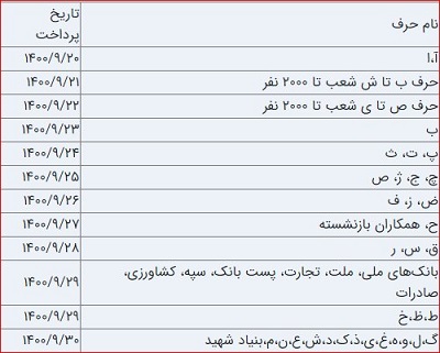 حقوق بازنشستگان و مستمری بگیران سازمان تأمین اجتماعی در آذر ۱۴۰۰ بر اساس حرف اول نام خانوادگی آنان و طبق جدول زیر واریز میشود: