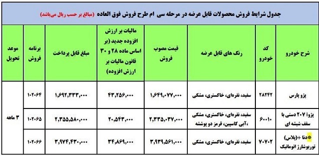 در این طرح سه خودرو پژو پارس، ۲۰۷ دستی و دنا پلاس با موعد تحویل سه ماهه به فروش میرسد.
