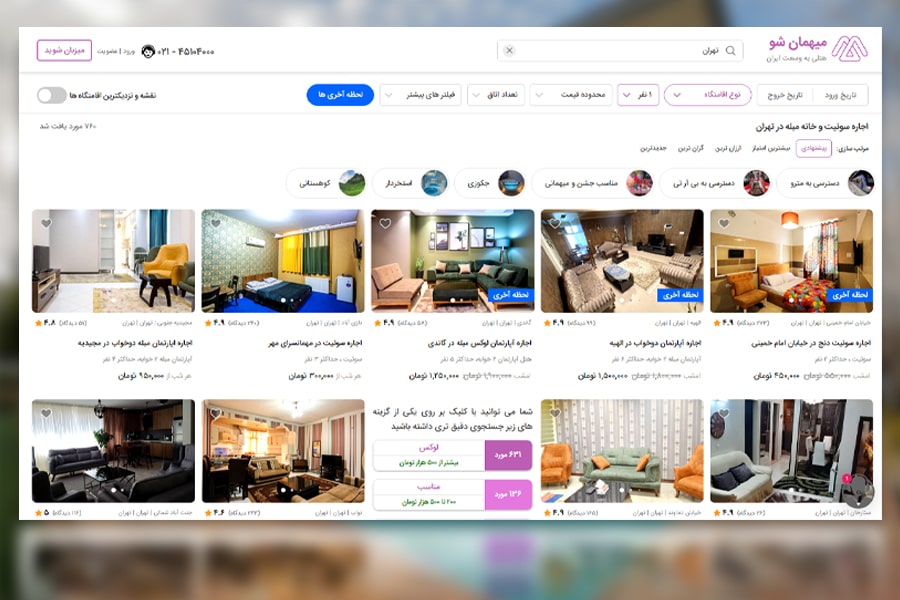 برای پیدا کردن اقامتگاه کافیست به وبسایت میهمان شو مراجعه کرده و شهر و تاریخ موردنظر را انتخاب کنید. سپس میهمان شو تمامی گزینههای ممکن را به شما نمایش میدهد. شما میتوانید با استفاده از فیلترهای مختلف گزینههای موردنظر را محدودتر کرده و کار خود را برای انتخاب اقامتگاه موردنظر راحتتر کنید.