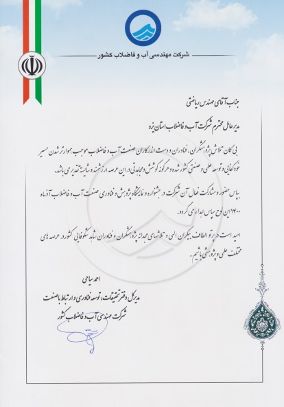 از شرکت آبفا استان یزد تقدیر شد ,احمد سیاحی مدیرکل دفترتحقیقات،توسعه فناوری وارتباط با صنعت شرکت مهندسی آبفا کشور