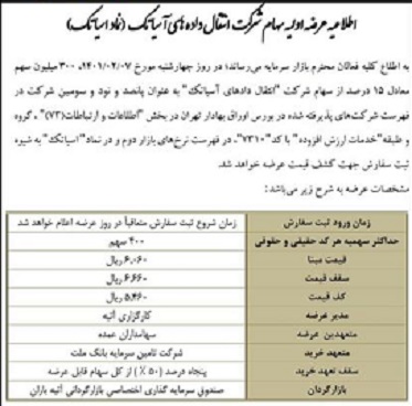 این سهام در بخش اطلاعات و ارتباطات گروه و طبقه خدمات ارزش افزوده با کد 7310 در فهرست نرخ های بازار دوم و در نماد آسیاتک به شیوه ثبت سفارش جهت کشف قیمت عرضه خواهد شد.