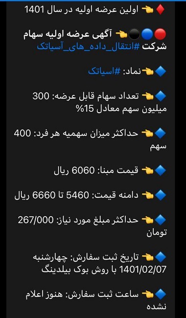 به گزارش آسیانیوز، نخستین عرضه اولیه های سال ۱۴۰۱ روز چهارشنبه هفتم اردیبهشت با نماد آسیاتک از سوی شرکت «انتقال داده های آسیاتک» ارایه می شود.