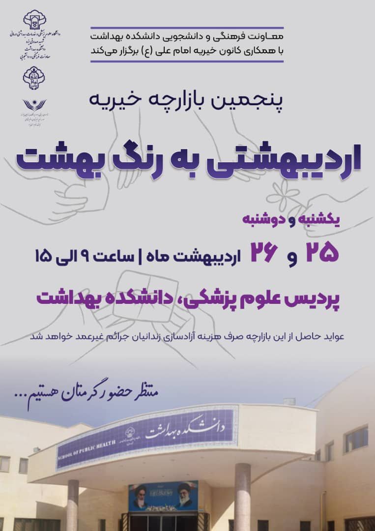 گفتنی است این بازارچه خیریه در تاریخ ۲۵ و ۲۶ اردیبهشت ماه سال جاری از ساعت ۹ الی ۱۵ در محل پردیس علوم پزشکی ، دانشکده بهداشت واقع در یزد – صفاییه – میدان عالم – بلوار شهدای گمنام – برگزار خواهد شد .