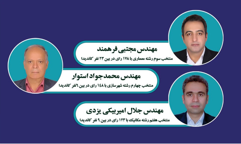 در این انتخابات که با مشارکت بیش از 95 درصدی مهندسین سراسر کشور برگزار شد، مهندس فرهمند با کسب 178 رای به عنوان منتخب سوم رشته معماری از بین 23 کاندیدا، مهندس محمدجواد استوار با کسب 148 رای به عنوان منتخب چهارم رشته شهرسازی از بین 6 کاندیدا و مهندس جلال امیربیکی با کسب 123 رای به عنوان منتخب هفتم رشته مکانیک از بین 9 کاندیدا موفق به راهیابی به دور دوم انتخاب شدند.